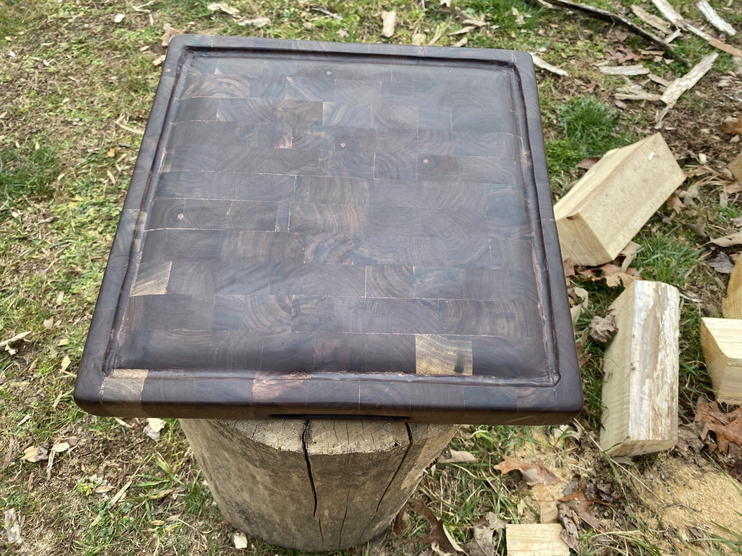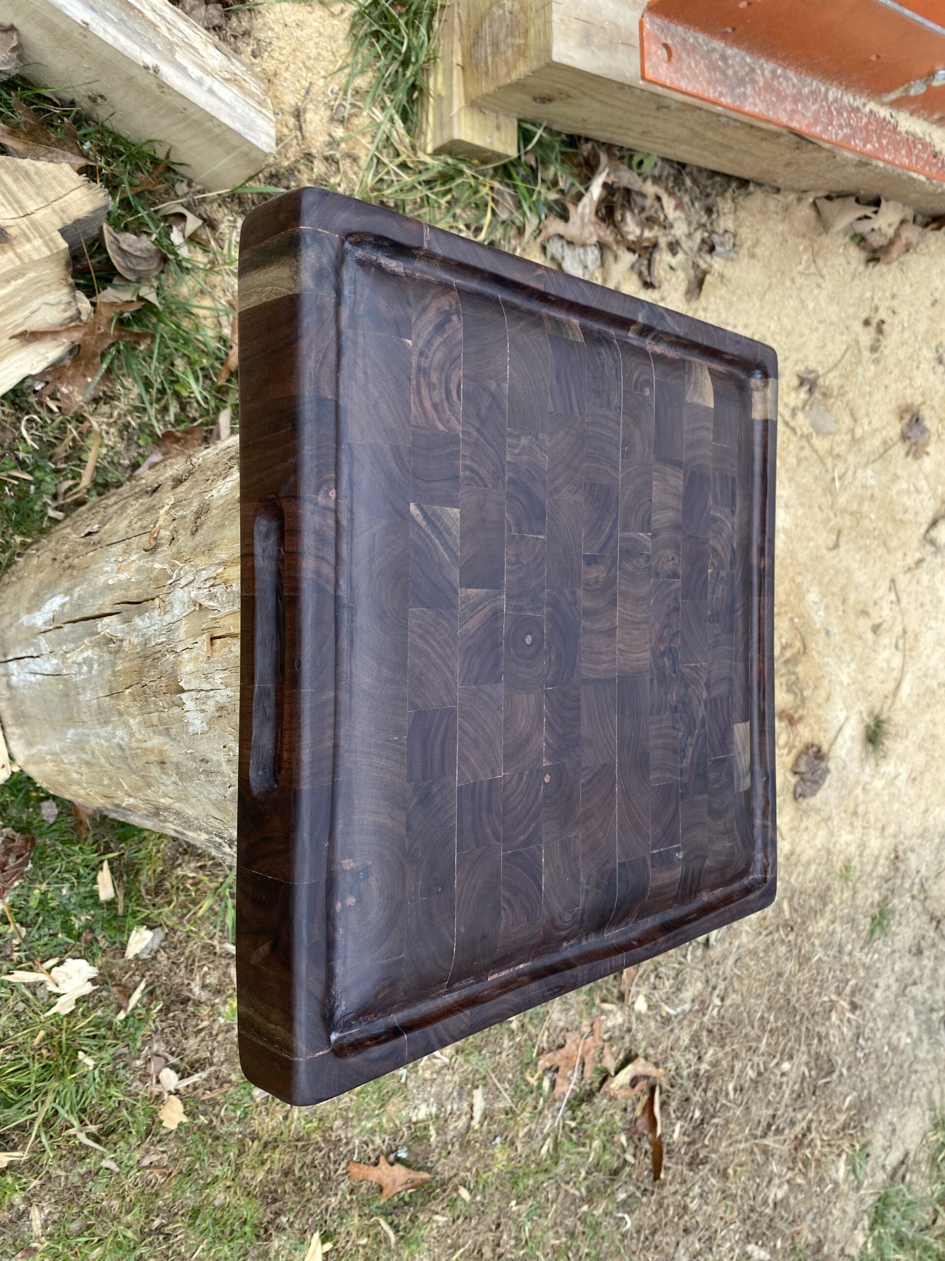 This end-grain cutting board began with a locally sourced black walnut tree that was knocked down by Hurricane Helene in my neighborhood. After paying a “finder’s fee” to the person who located it for me, I brought home the logs from the tree on a trailer and cut slabs from it with an LX50 Woodmizer in my backyard. The slabs were then kiln-dried, planed, cut into strips, glued-up, cut into more strips that were flipped so the end grain was on top and bottom, and glued-up again.