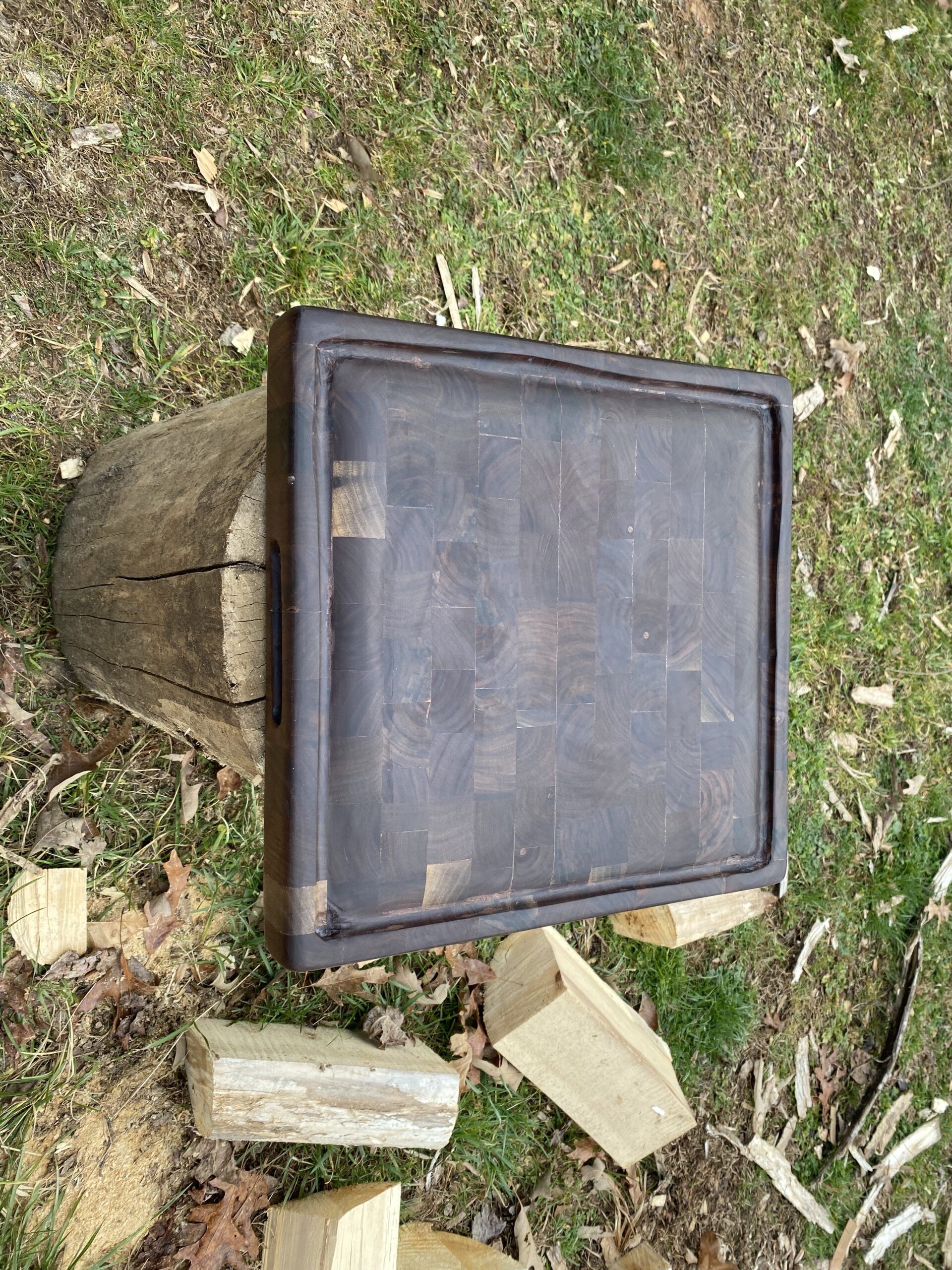 This reversible Black Walnut end grain cutting board is 14 and 1/2″ long by 14 and 1/8″ wide by 1 and 7/8″ thick.