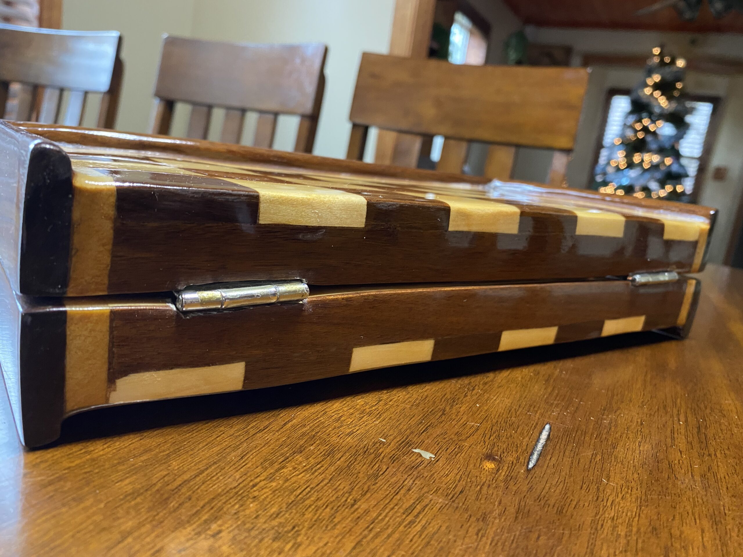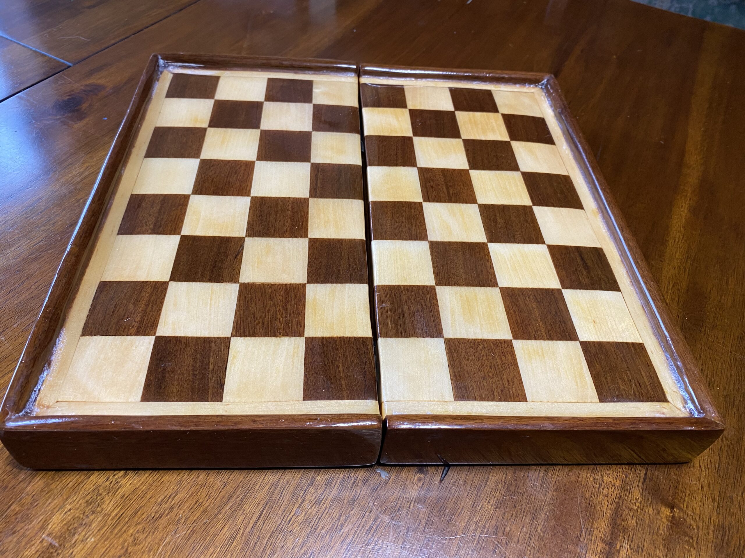 When closed, the chess box is 13 and 5/8″ long by six and 7/8″ wide by 2 and 3/8″ deep. When opened, the chess board measures 13 and 5/8″ square by one and 1/8″ deep.