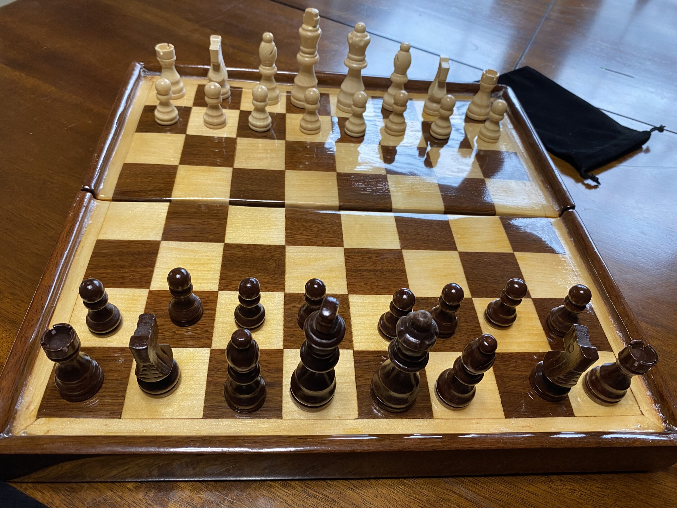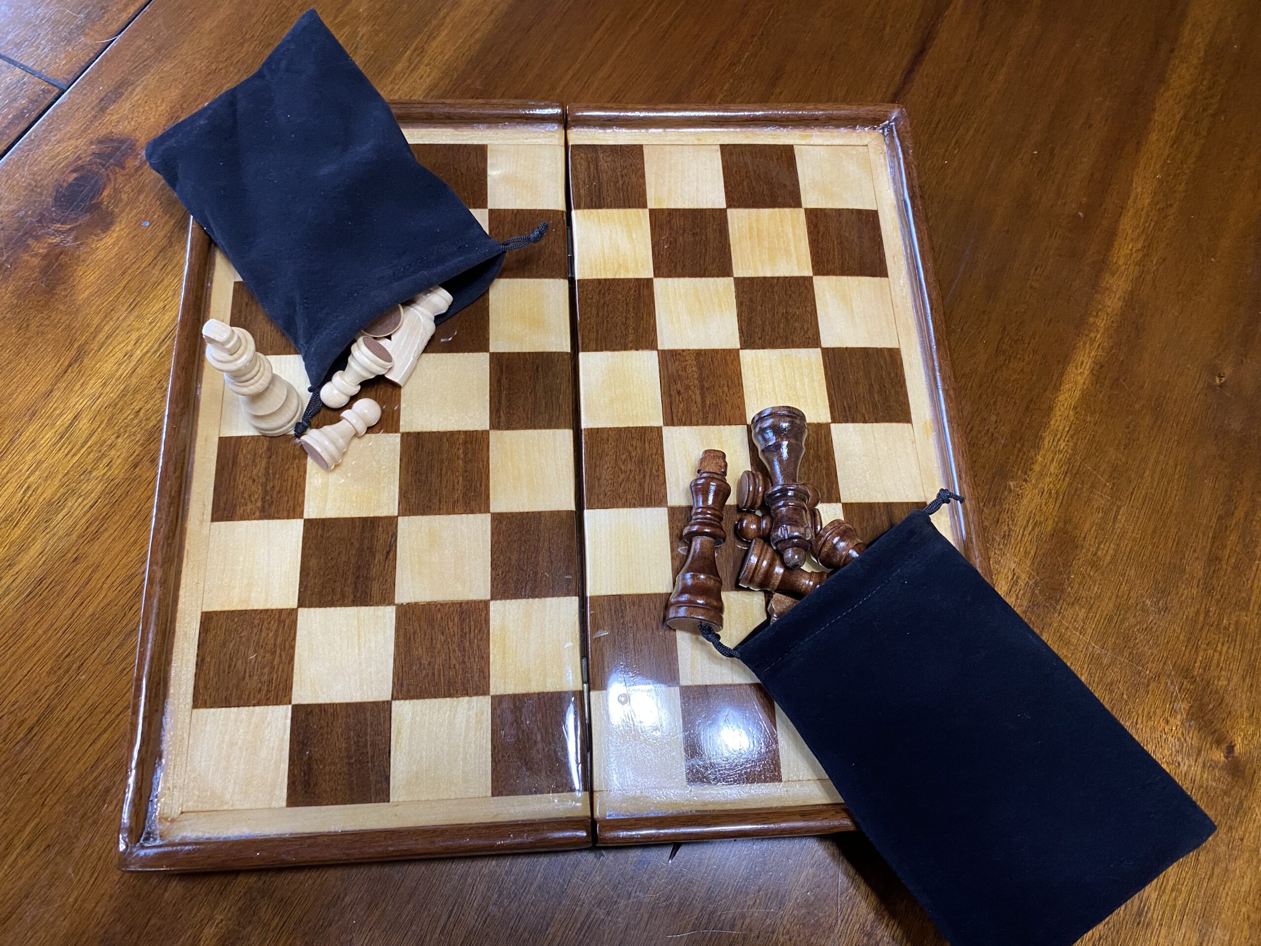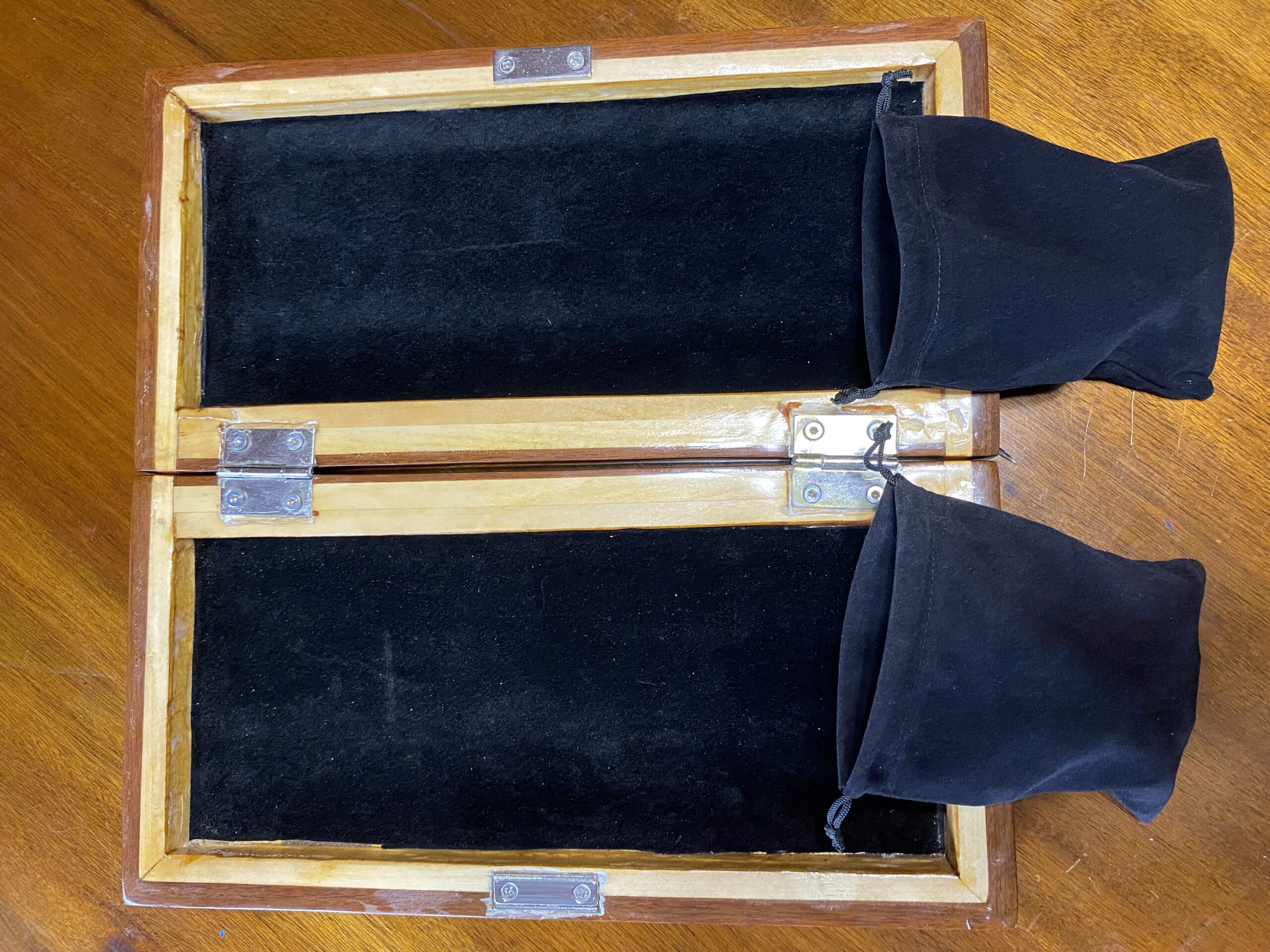 Your Ipe and Basswood chess box comes with a set of carved wooden chess pieces, contained in soft, black drawstring bags, one for each color.